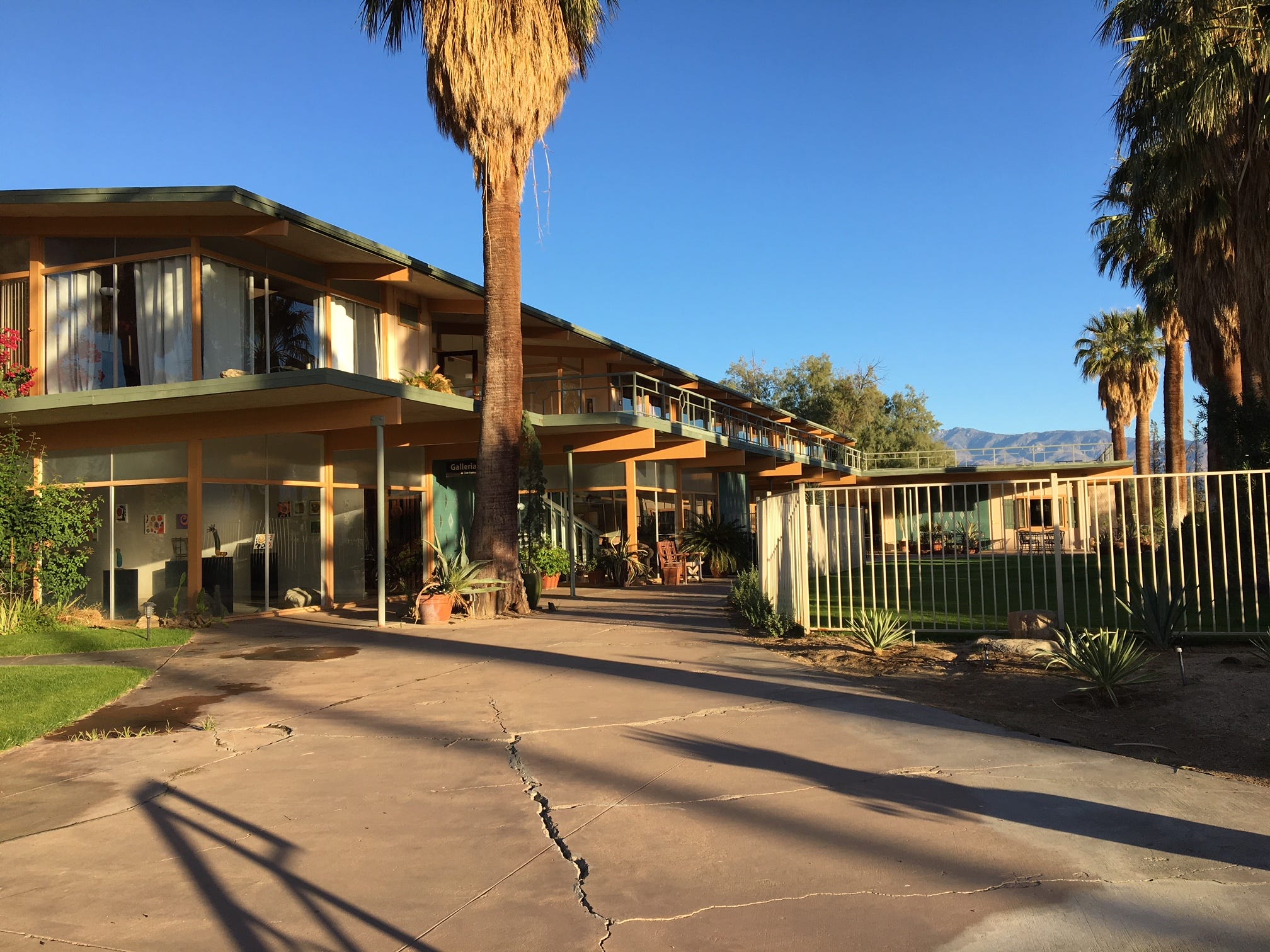 From the rooftop terrace we watched the setting sun light up the Santa Rosa Mountains with a brief blaze of color. Palm trees rimmed the darkening horizon, while a full-sized metal sculpture of a sea turtle stoically grasped a golf club in its mouth at the pool’s edge. No other cars were in the parking lot. No other guests arrived.